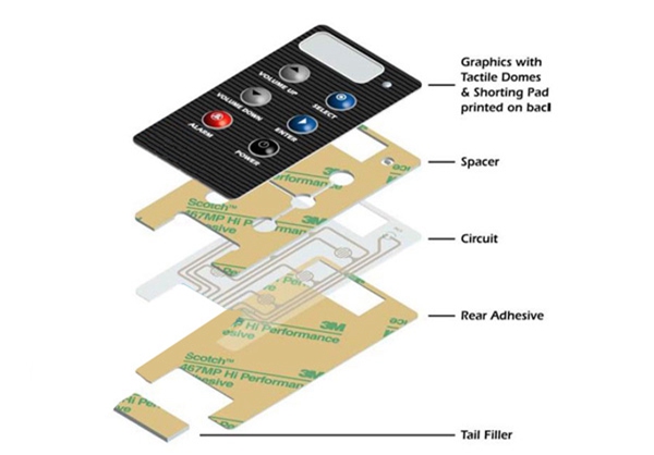 輕觸開關(guān)面板是由具有 彈性的導(dǎo)電材料和絕緣材料層組成的一種多層平面型線路面板,主要由面膜、面膜背膠、上線路、隔離層、下線路和背膠組成,其中面膜層主要采用的材料是PC、PET、PVC。面膜背膠、隔離層和背膠層材料是雙面膠(俗稱三文治),膠層材料主要有3M、SONY、日東、綜研、冠郝、四維等 產(chǎn)品;上線路層和下線路層是在不導(dǎo)電的薄膜(PET)上印刷導(dǎo)電性銀漿或碳漿,及不導(dǎo)電性絕緣墨的一種線路板。
